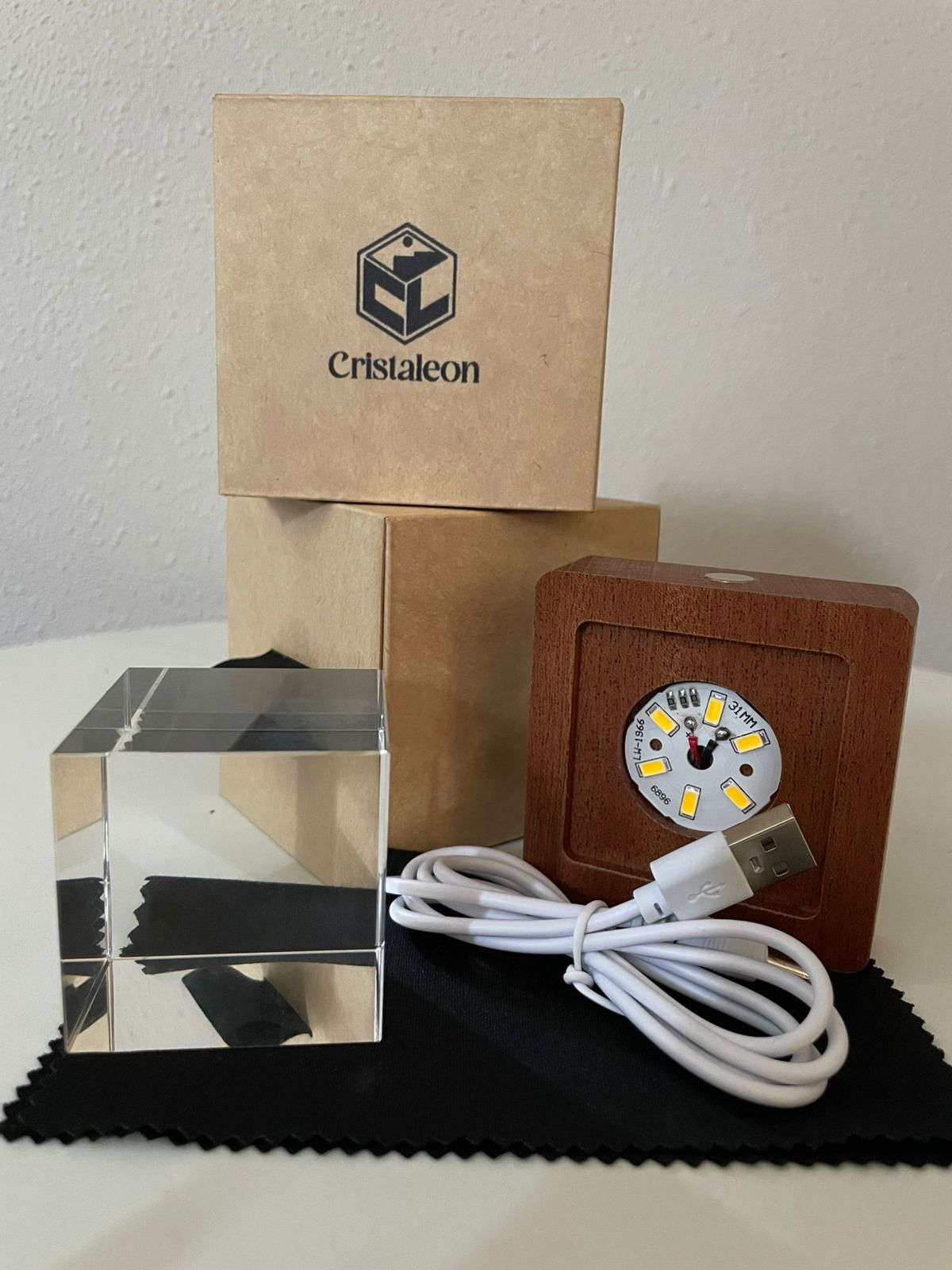 Un elegante cubo de cristal de alta claridad con grabado láser 2D personalizado. Ideal para regalos especiales, decoración o momentos que quieres recordar para siempre. Incluye base de madera con luz LED cálida que realza el grabado y convierte tu diseño en una pieza única y luminosa. Incluye cable para cargar batería de luz y paño de limpieza en su elegante caja. Las dimensiones del cristal son 5x5x5cm