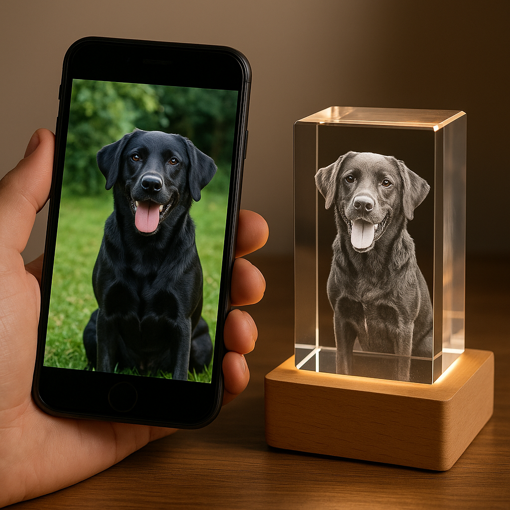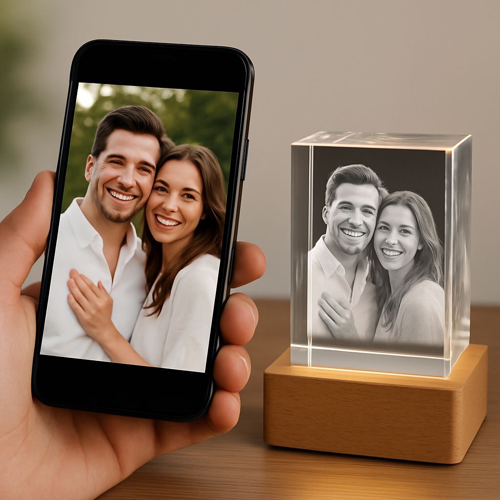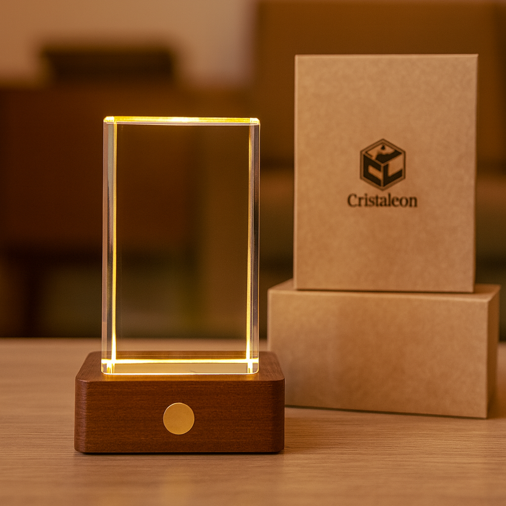 Cristal rectangular vertical de calidad premium con grabado láser 2D personalizado. Su forma alta entrega mayor superficie para retratos y diseños detallados. Incluye base de madera con luz LED cálida, perfecta para resaltar tu imagen y transformar cualquier espacio. Incluye cable para cargar batería de luz y paño de limpieza en su elegante caja. Las dimensiones del cristal son 8x5x5cm, con orientación vertical.
